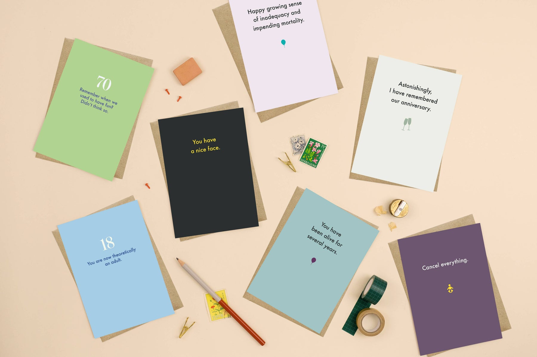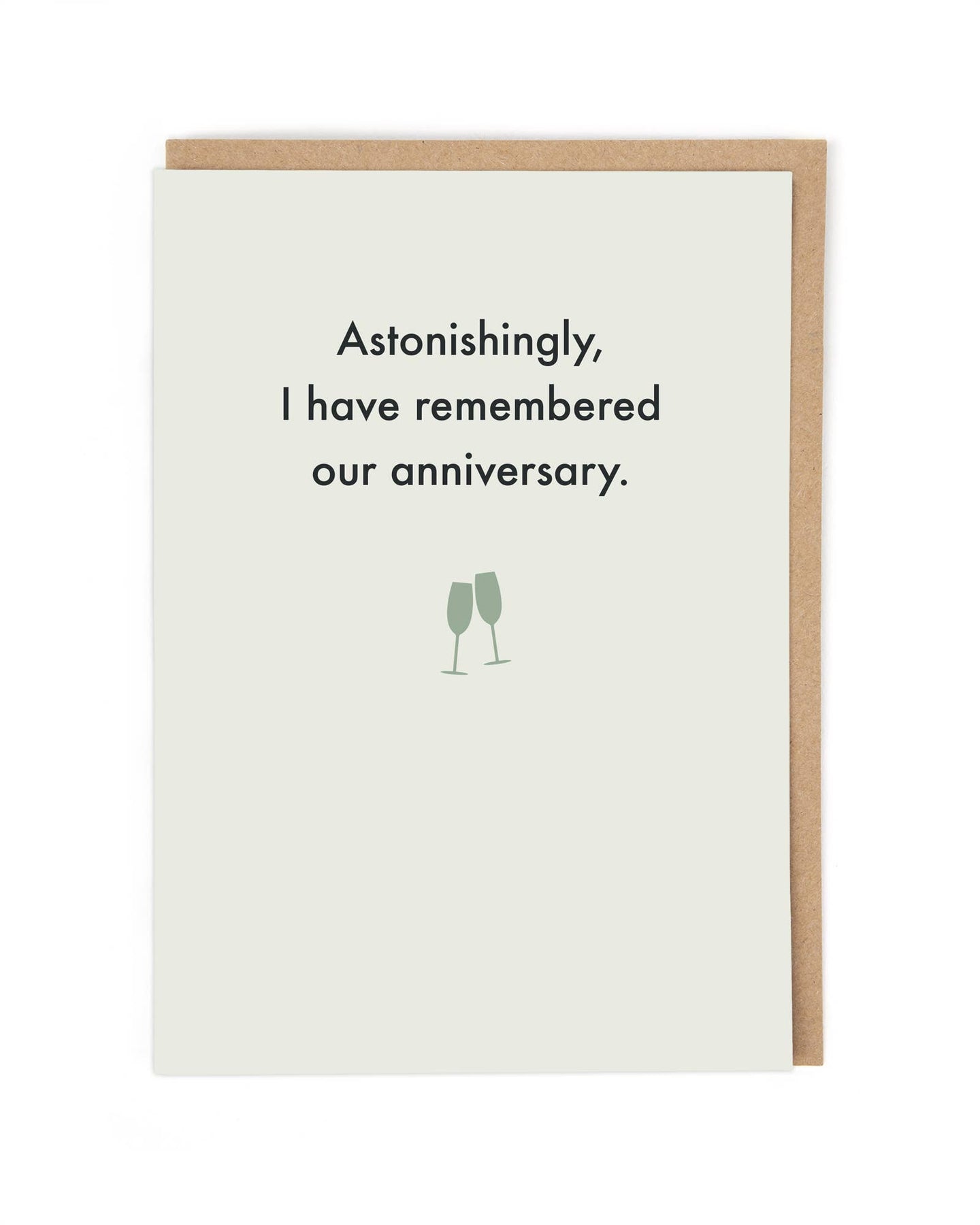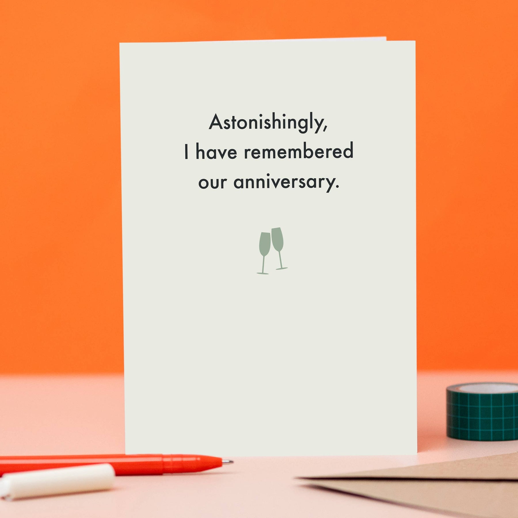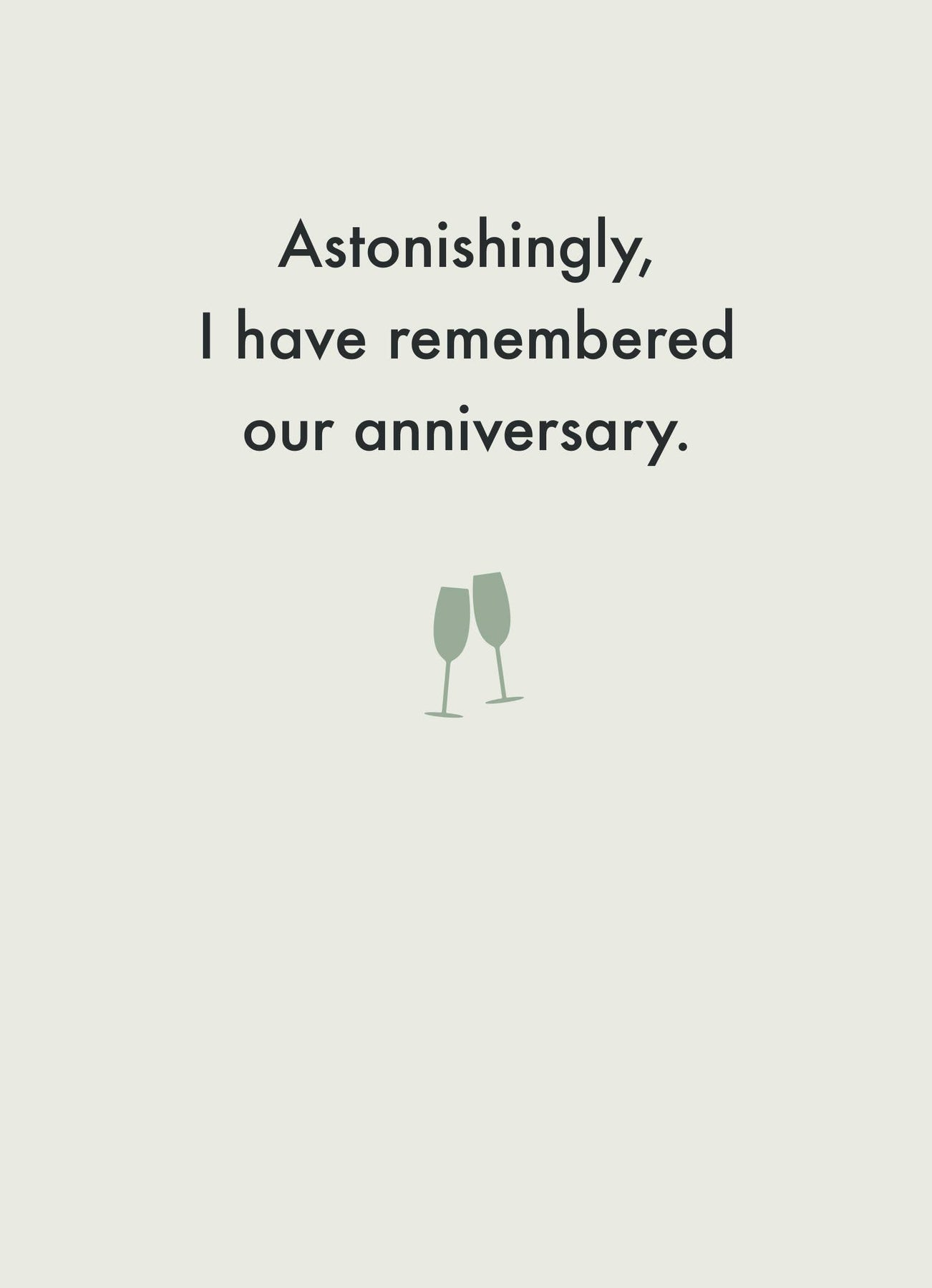 “Astonishingly, I have remembered our anniversary" anniversary card from the Deadpan range. We're thrilled to announce we've taken over the licence for Deadpan Cards. The cards have a clear signature style of dry humour, cynicism and are brilliantly blunt. • Size: 12 x 17cm • Envelope: Kraft • Printed in the UK on high-quality 100% recycled board