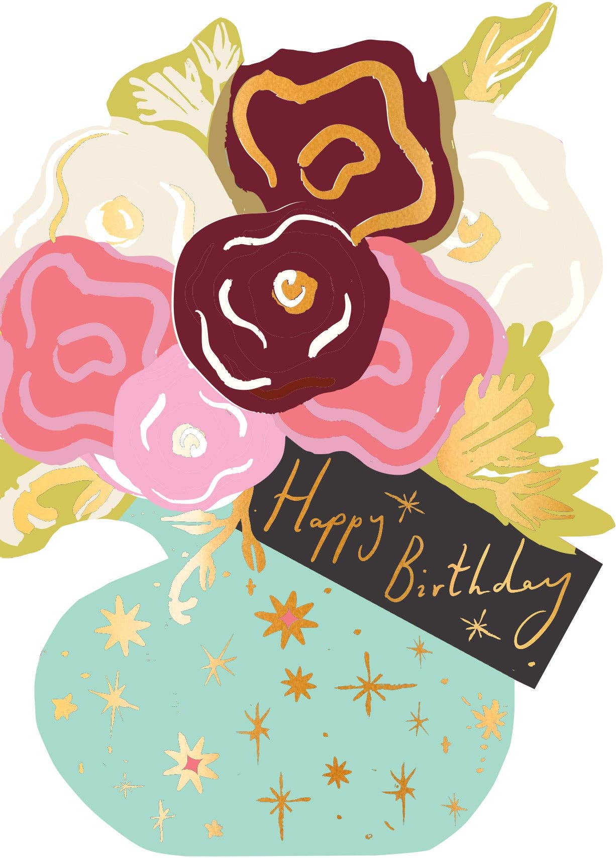 Blooms that last beyond the day. This charming birthday card from the Type and Story collection by Niccy Iseman features a fully cut-out beautifully illustrated vase overflowing with flowers. A tag reads 'Happy Birthday' and the design sparkles with metallic foiled details - making it a joyful and elegant way to celebrate someone special.