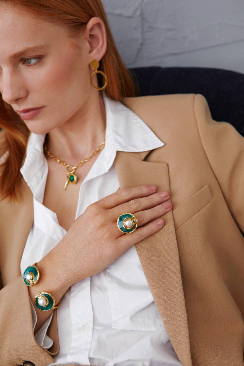 Gemstone and pearl detail cocktail ring with green tiger glass Handcrafted in the Ashiana workshop the Gaia Ring features faceted tiger glass with a semi-precious rose quartz and freshwater pearl gemstones. An adjustable statement ring, with a matching bangle available from our range to create a complete look.