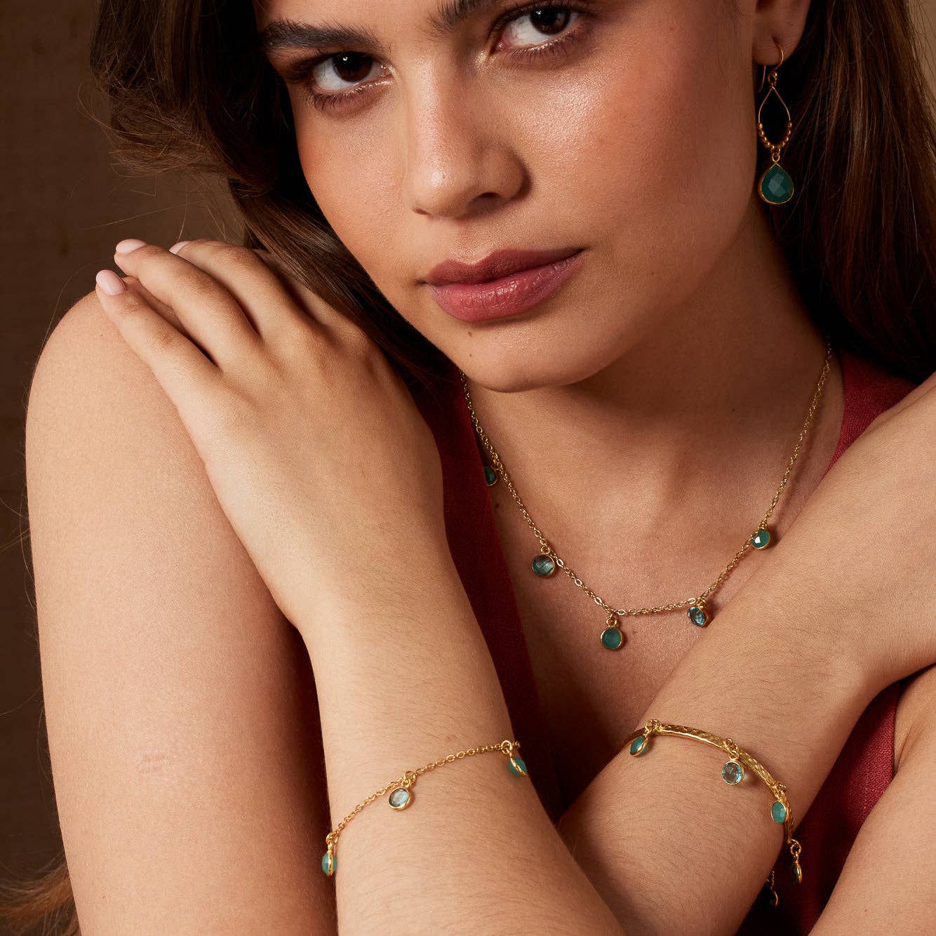 Gold bangle with set gemstone charmsDelight in the mesmerizing allure of the Maeve Charm Bangle Aqua. Beautifully handcrafted, this bangle is adorned with aqua chalcedony and blue topaz gems that shimmer with your every move. The 22-carat gold-plated brass ensures a durable, luxurious finish that complements any outfit. Its adjustable 16 cm design provides a perfect, comfortable fit for all-day elegance.