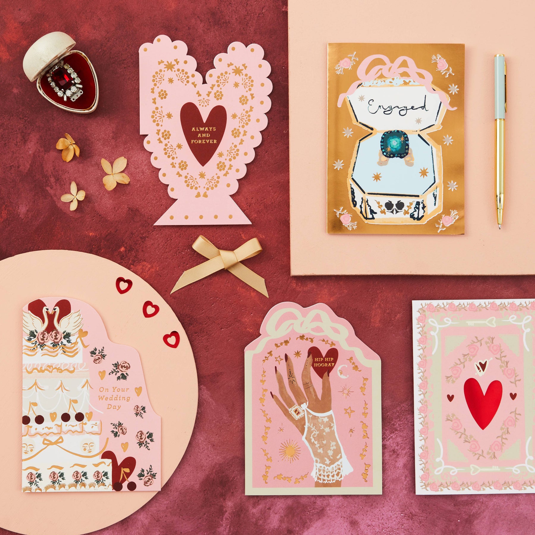This timeless wedding celebration card is bursting with vintage vibes. Inspired by the decadence of yesteryear, this showstopper features a stunning tiered cake, adorned with cherries, delicate roses and love hearts in shades of pink, red and gold - all topped off with a pair of swans. The bespoke die-cut shape adds to the striking design of this premium card. The message on the front of this card reads 'On your Wedding Day'.